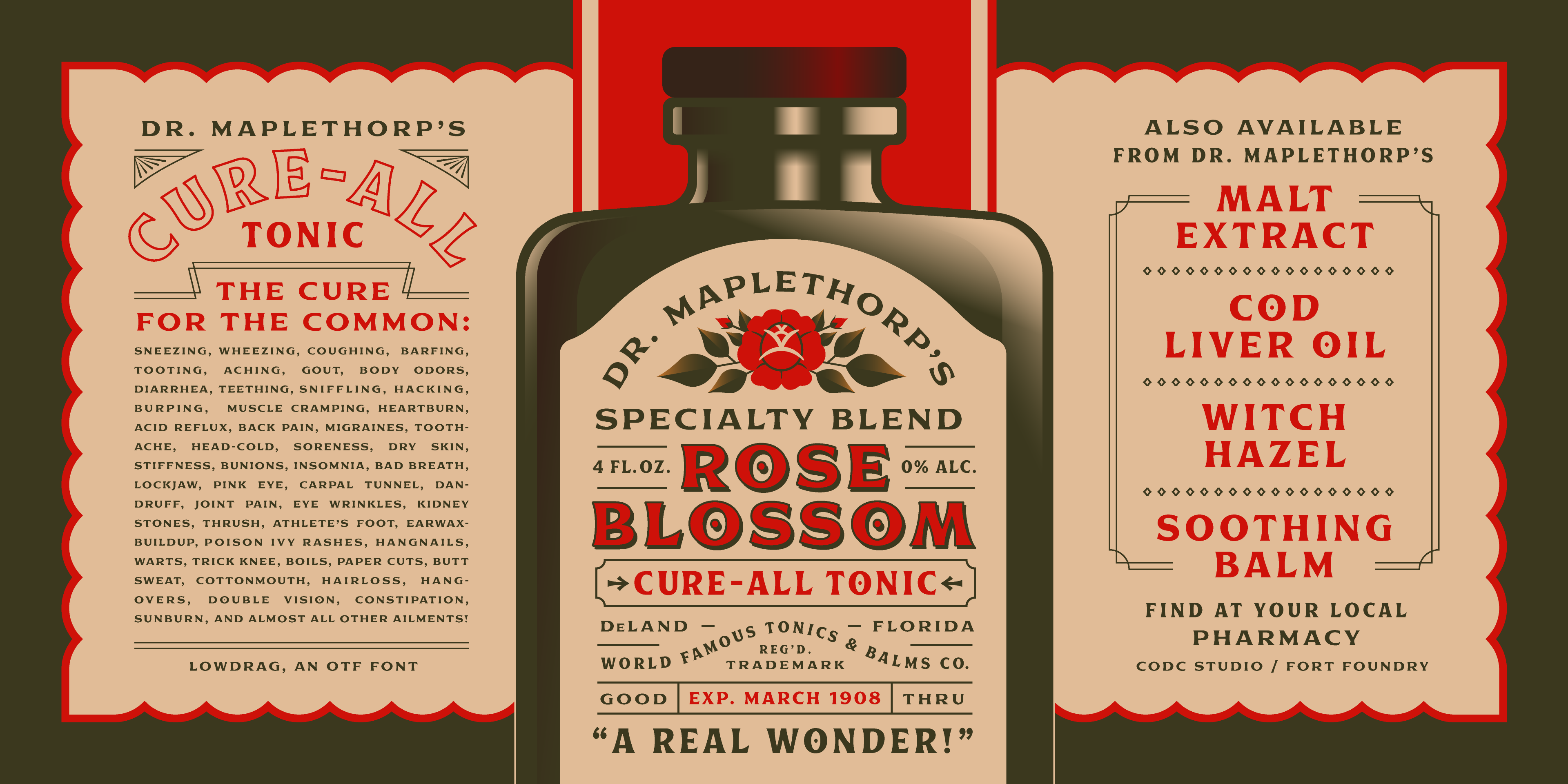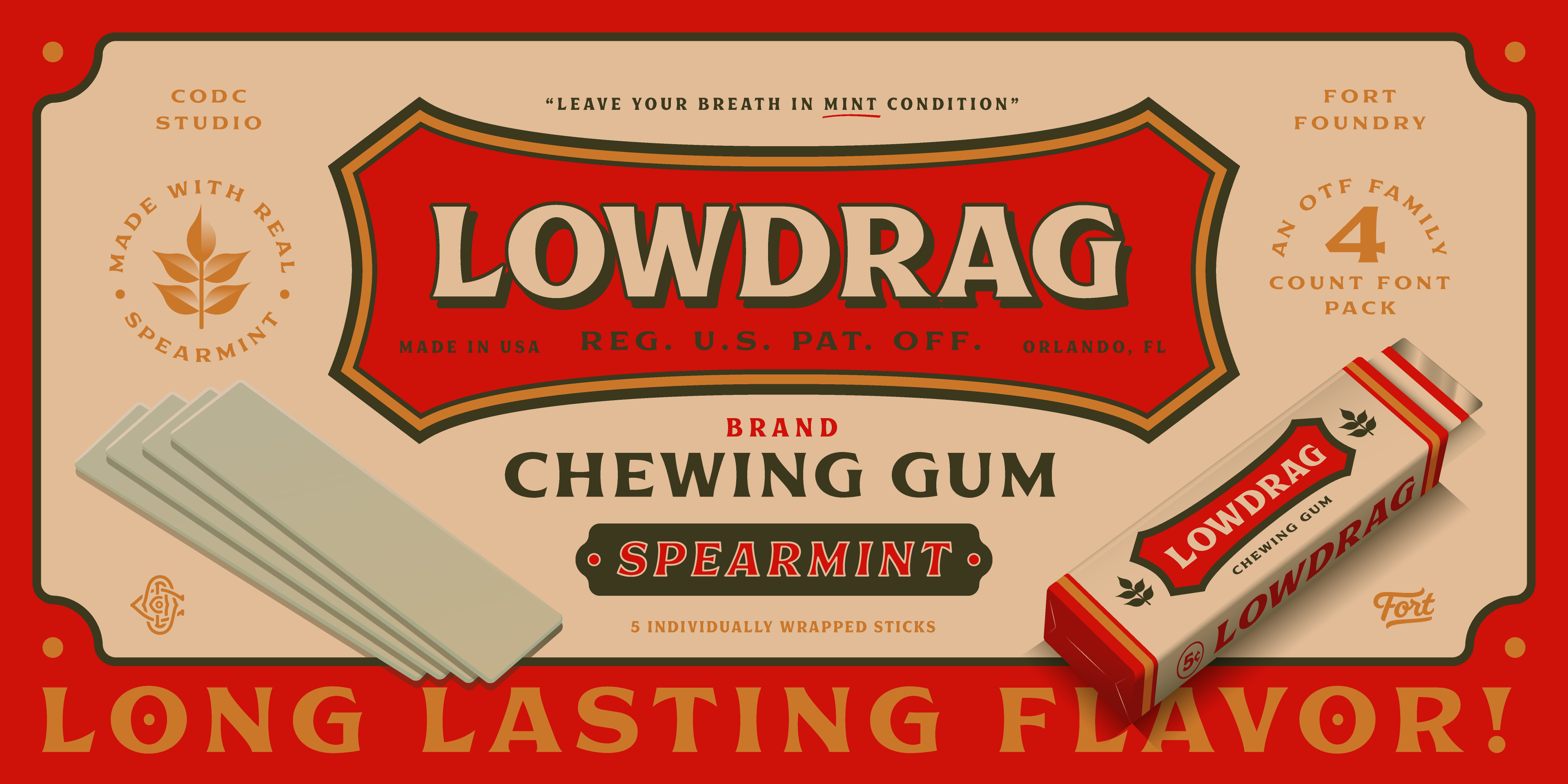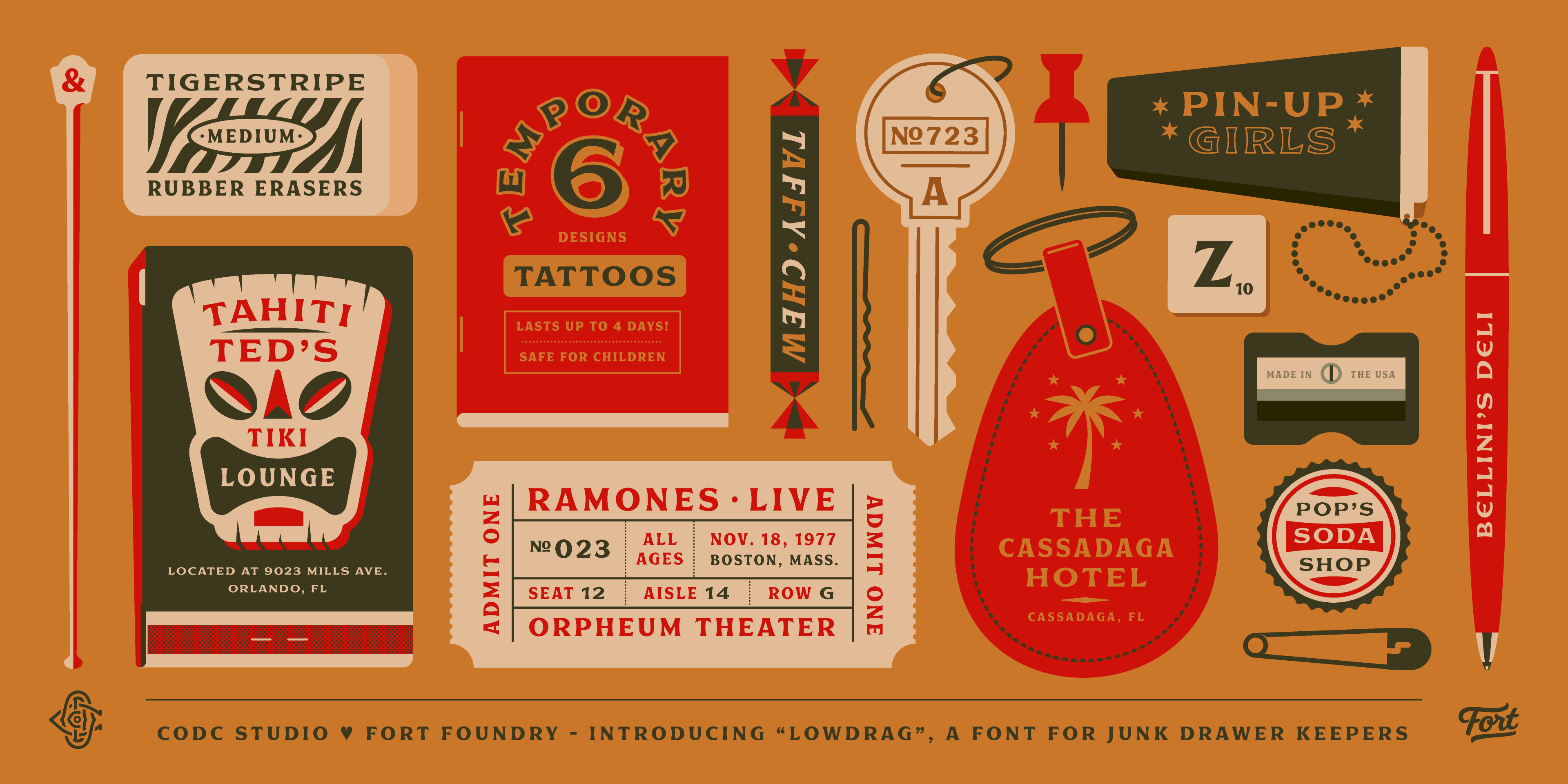 Designed by Clark Orr, Lowdrag can race to the scene of your next project with vintage charm and flair. Like an old friend with new sideburns, it's got its quirks, but retains some familiar charm. Take it for a spin on a spirited label or make headlines for that new gig you got in town. Lowdrag won't promise that people will show up, but at least the flyer will look nice.