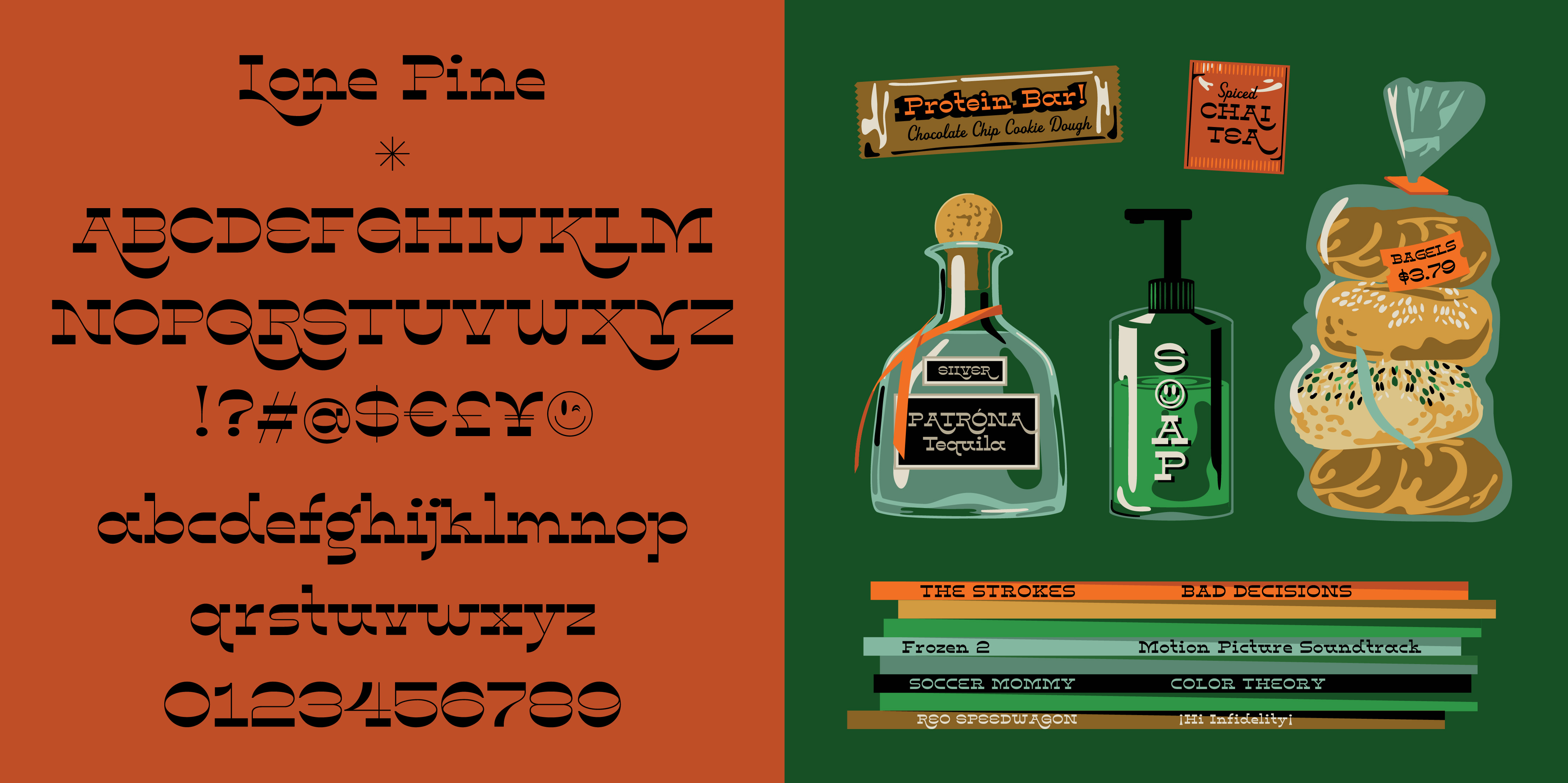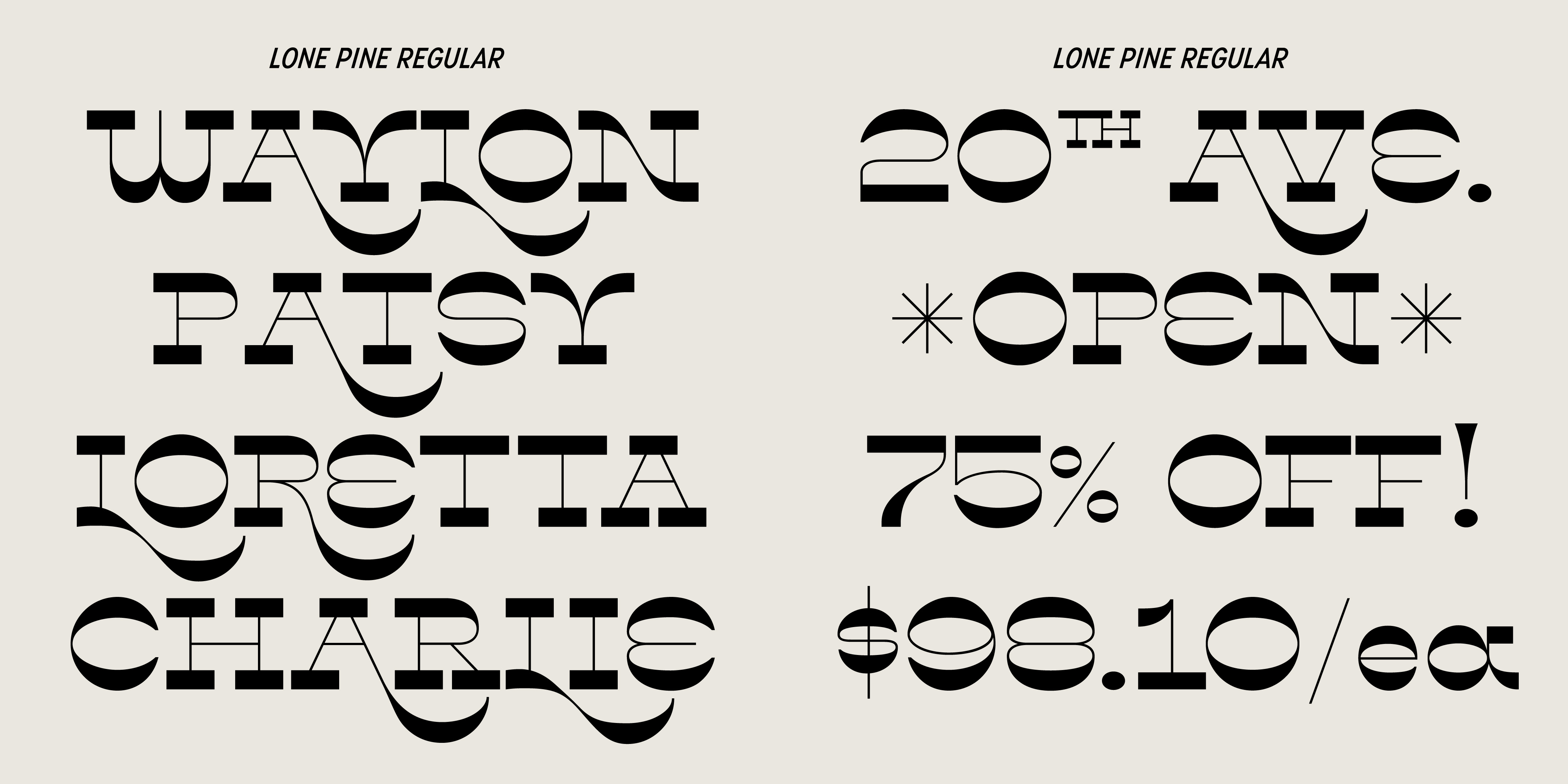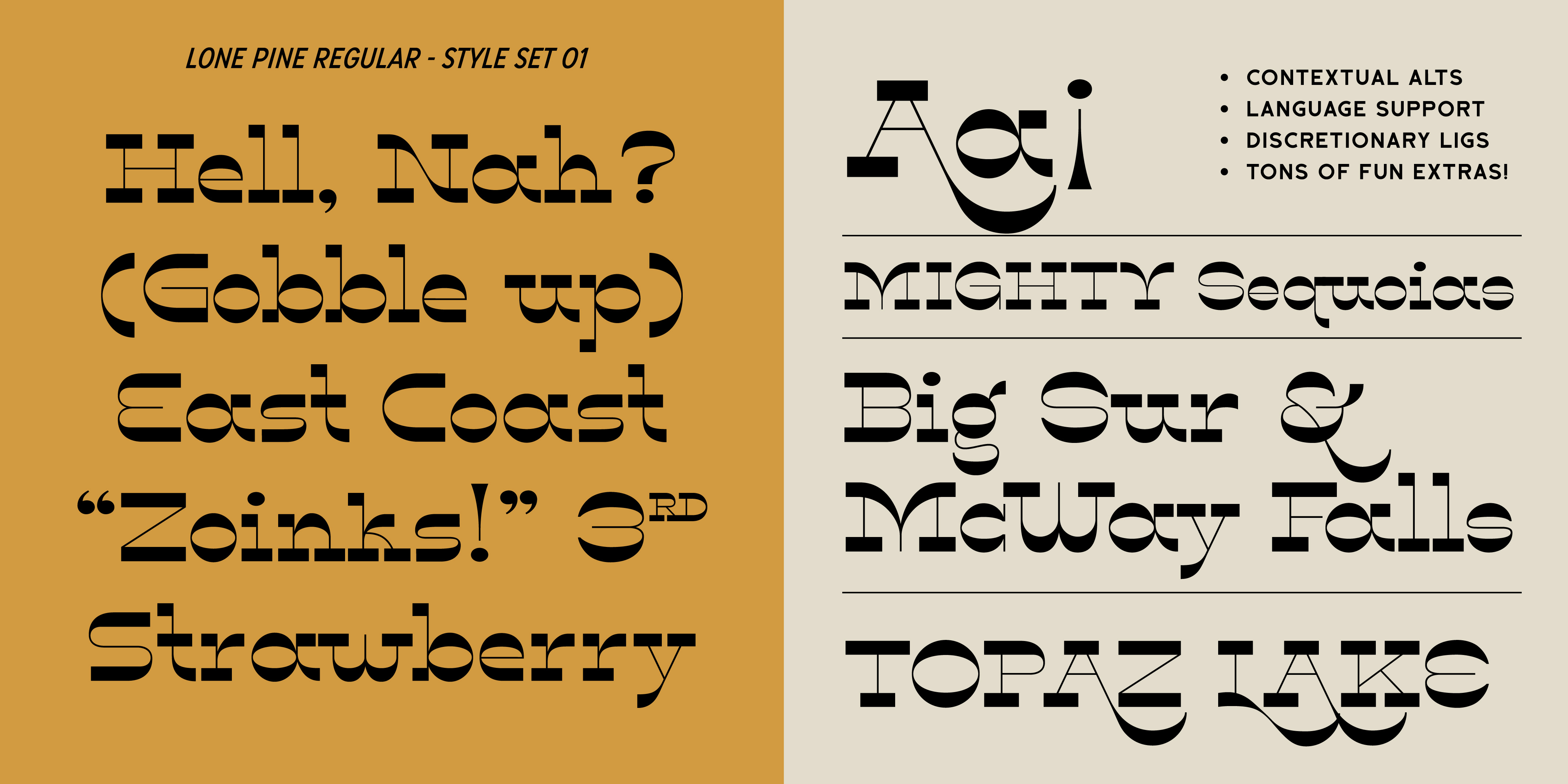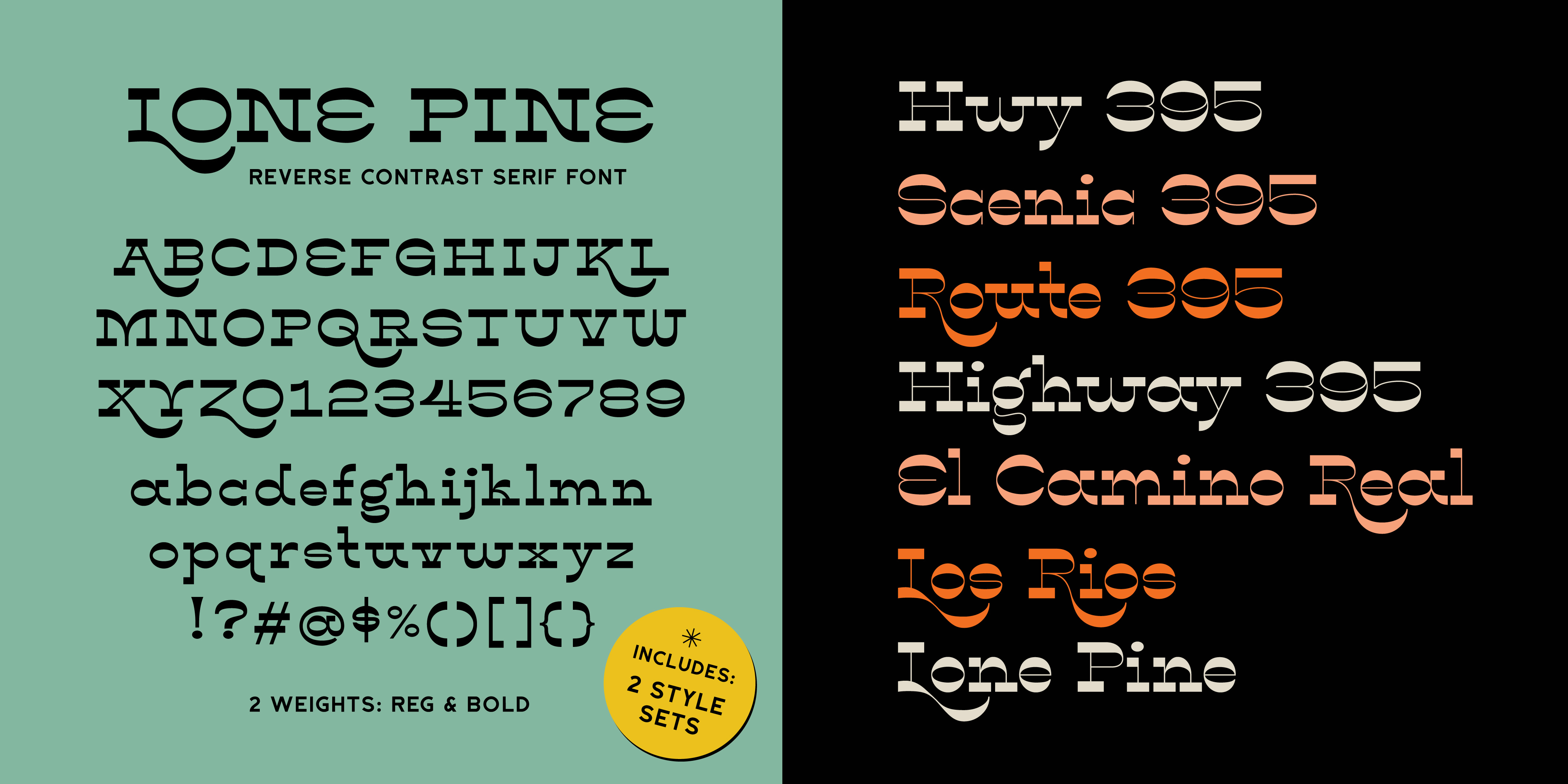 Lone Pine font by Hoodzpah is a reverse contrast serif typeface with 110% zazz and juuj. It’s inspired by Route 395 in California, which runs along the Eastern Sierra Nevadas; And by the many towns scattered along the way, namely Lone Pine, CA at the base of Mt. Whitney. This display font is super high contrast, and features big swashes for immediate wow factor. Turn on style set 01 for a more 70’s sci-fi look.