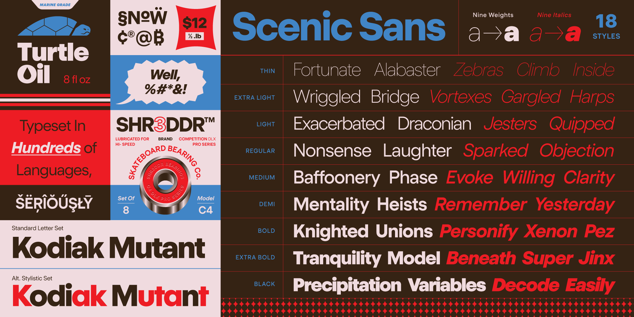 First introduced as the first exclusive drop from our Secret Lair, Scenic Sans is now available in 9 weights from Thin to Black with matching italics and a variable version. The family provides comprehensive coverage for editorial, branding, wayfinding, and information design.