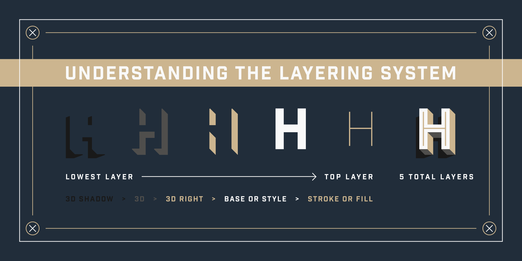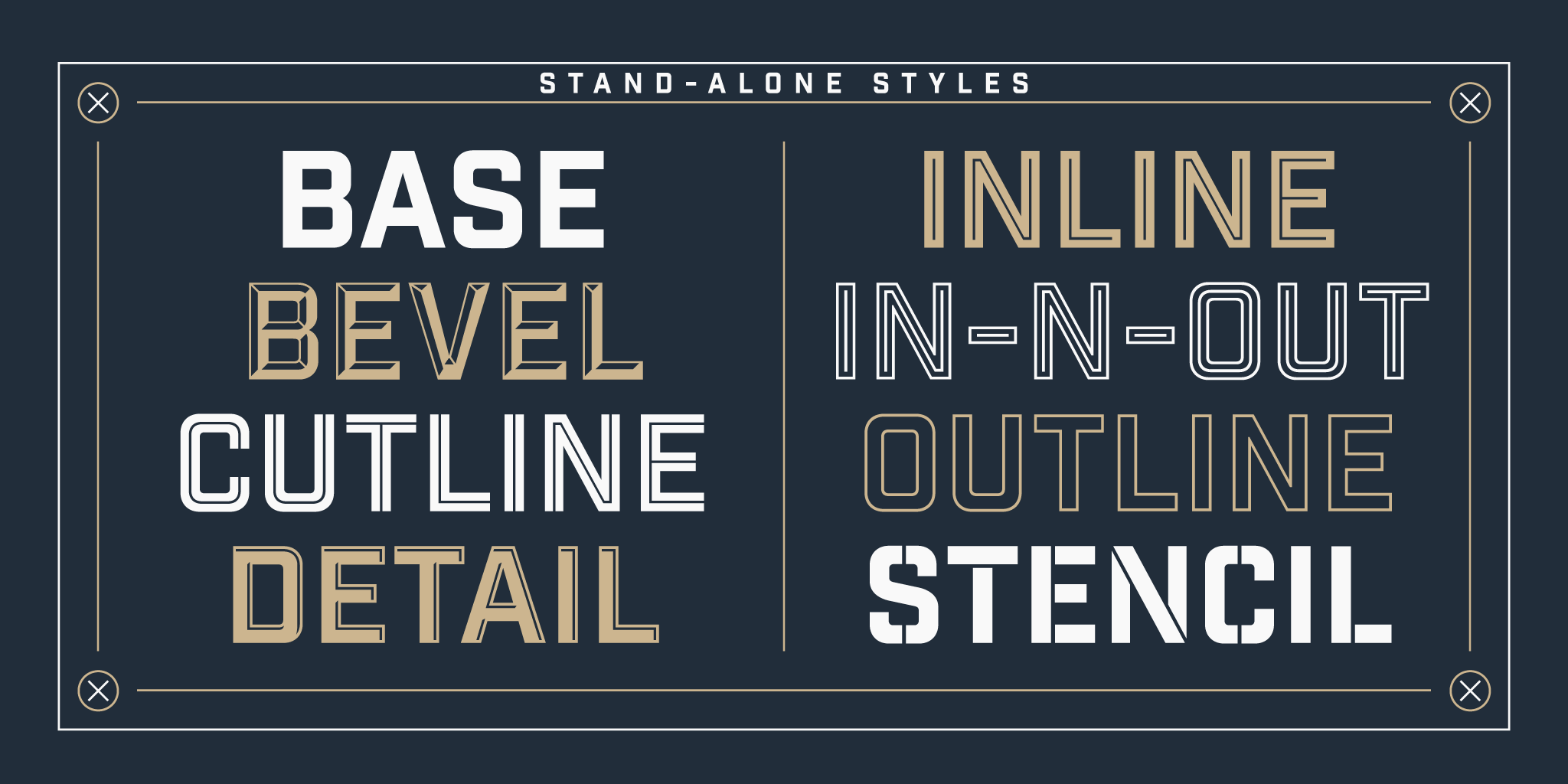 Based on the bold uppercase style of the Industry family. The typeface comprises numerous stand-alone styles along with a layered type system. Take a look through the manual or watch a video tutorial on layering.