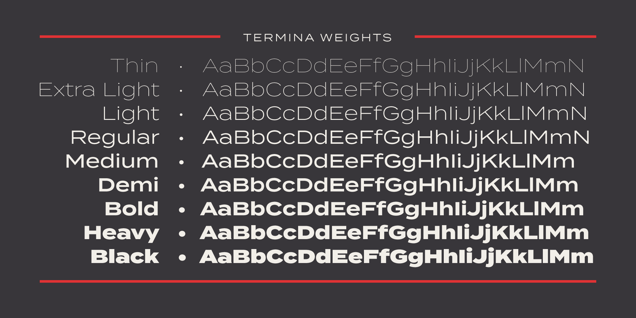 Amongst the landscape of geometrics, Termina breaks the norm with its generously wide letterforms.