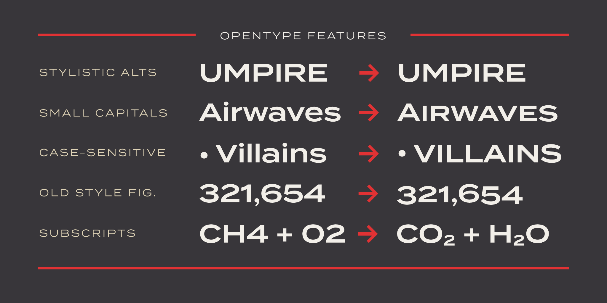 The various uses can range from advertising to logotype—from small descriptors to pull quotes. The family’s high x-height and wide letterforms help retain legibility and readability at smaller sizes.